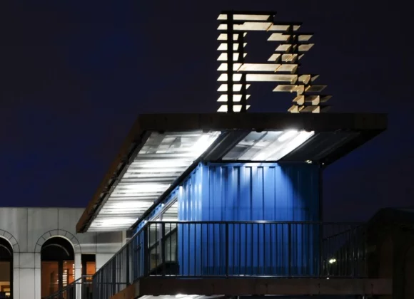 It is fabricated from 20mm thick laser cut Corten steel sections to create its ādashedā appearance that becomes strikingly 3D when illuminated at night.