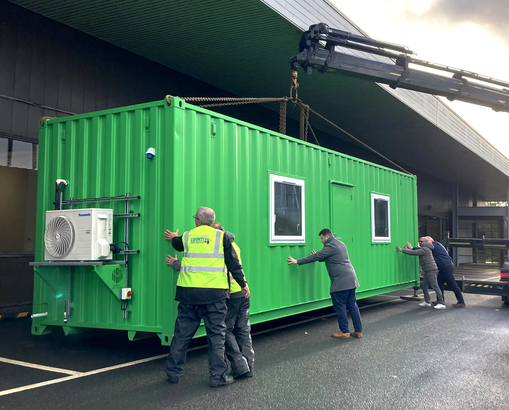The container laboratory was delivered to the NPK Recovery site in Bristol by our trusted haulier. Hoping to be placed within the building, the delivery team were able to transport the unit through a tightly sized entryway to its temporary home. Through skill and determination, they were able to place the container in the desired place without issue.
